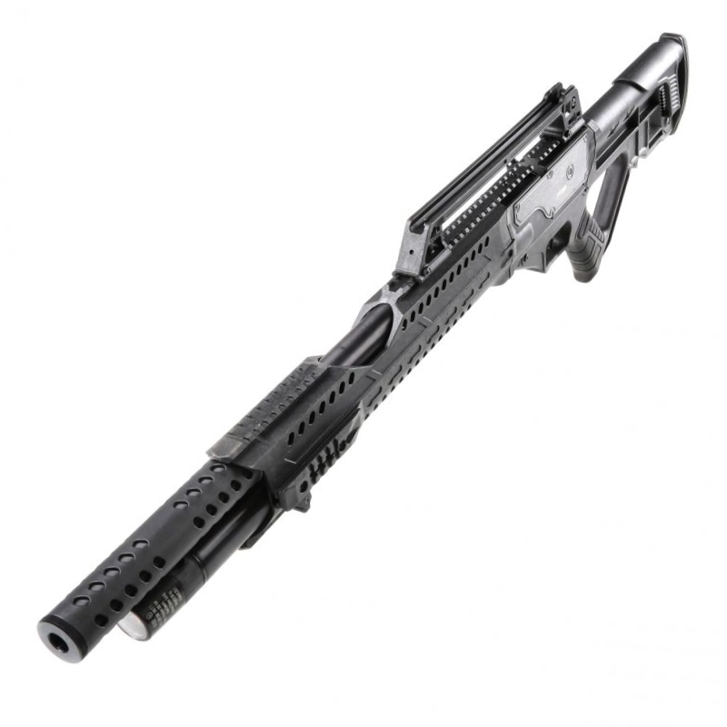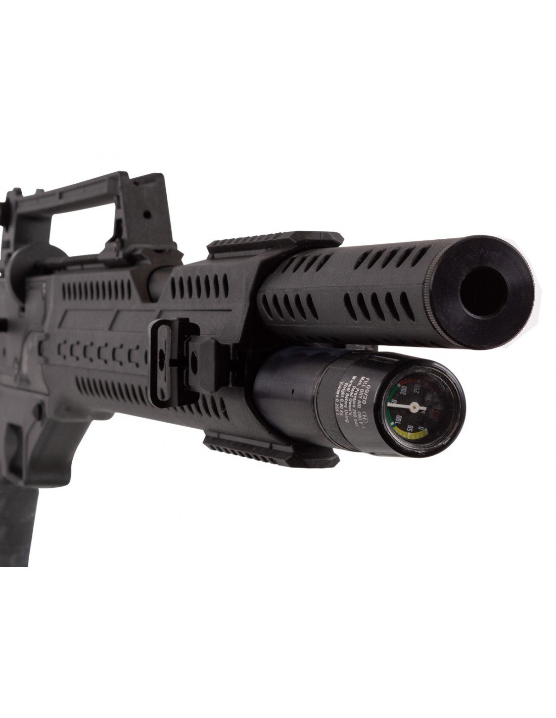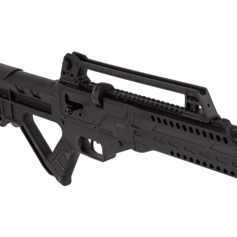 La culata es sintética, de diseño táctico, con empuñadura ergonómica tipo pistola y una estructura robusta pensada para soportar el uso intensivo. Incluye riel Picatinny superior para montaje de miras ópticas y riel inferior para accesorios. El rifle incorpora manómetro integrado para control de presión y seguro manual para una operación más segura.